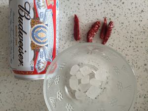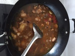 肉变色后,加啤酒(100g),加水,加酱油,加盐巴,没过鸡肉,大火煮