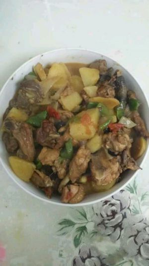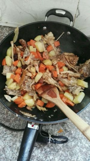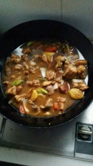 1,锅里倒好油,把鸡炸至金黄色 2,倒入佐料干炒 3,加入水,滚开后,加入土豆,香菇等一锅炖