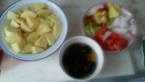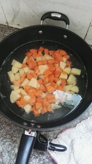 胡萝卜与土豆切块,焯熟。(如果有微波炉,可以在盘子里加一些水,包保鲜膜加热3分钟左右)
