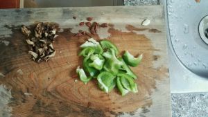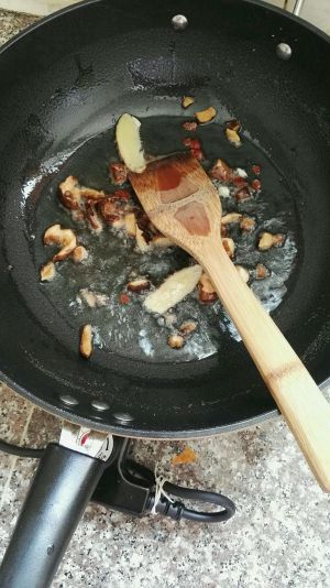 香菇先泡发,切丁,切好蒜与青椒,八角分成小块