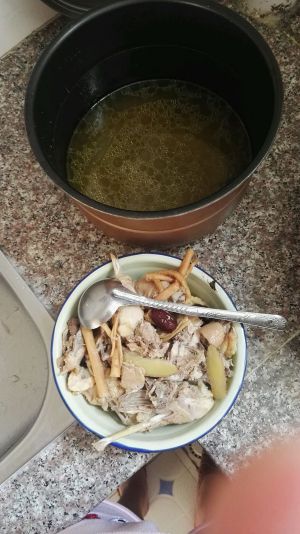 炖好以后,就可以将肉和汤分开。鸡汤可以先喝啦~