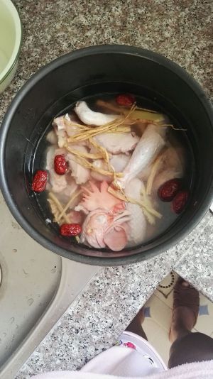 鸡仔洗干净后,切块,加入红枣、姜片3片、当归、料酒。加入的沒过食材