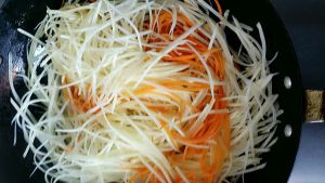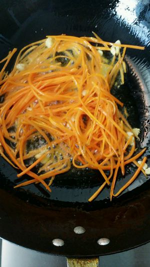 放适量的油、加入葱花爆香、炒出香味后加入沥干水的土豆胡萝卜丝、煸炒两分钟