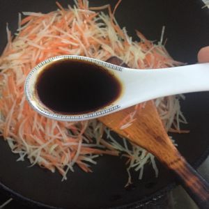 放入一汤匙酱油、翻炒1-2分钟