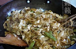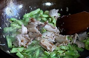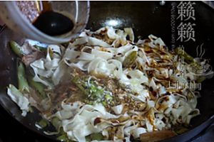炒到三、四成熟度时将肉片回锅,喷点料酒,生抽、老抽,糖、盐翻炒均匀;