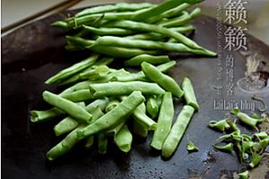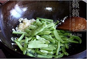 先把蒜爆香,肉煸炒熟,放入八角,倒入酱油,料酒,糖,然后放入扁豆煸炒到半熟。