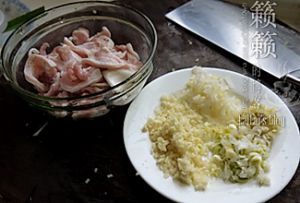 五花肉切薄片后,放点料酒、盐,研磨一点点黑椒碎拌匀,腌制15分钟左右;大葱、青蒜、生姜、蒜瓣、洗净后切末备用,干红辣椒去蒂去籽剪成椒圈状备用;
