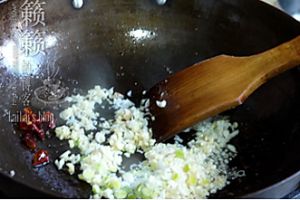 就着锅里的底油,将干红椒下锅、将2/3的姜末蒜末葱末下锅煸炒;