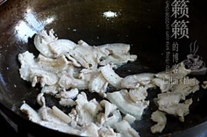 将肉片片中小火煸炒至出油表皮微黄焦香时,盛出控油备用;