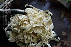 把手擀面抖开,揪成一段一段的平铺在菜面上,