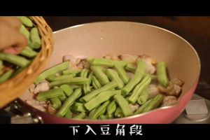 炒锅烧热,下入五花肉煸炒到肉片变色,下入葱姜末后,下入豆角段