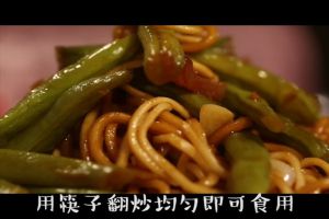 一手拿锅铲一手拿双筷子,兜着锅底一铲,将锅里的扁豆、面条、姜蒜末等和在一起挑起抖开,充分拌匀,熄火装盘即可。