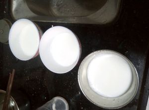 将碗中牛奶放凉,着急的伙伴可以用凉水加以辅助,找一个大于碗的盆,先放入温水,因为刚出锅的牛奶比较烫,直接放凉水害怕炸碗,,,所以,温水适应后,在放入凉水,放凉的过程中奶会结一层奶皮。