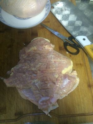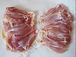 用剪刀或是小刀将下腿部划开,骨头剔掉,鸡肉用松肉锤拍松,皮不要弄破