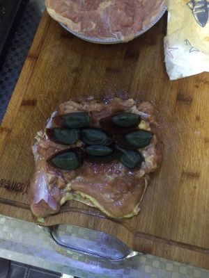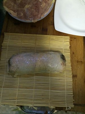 腌制完毕后,在肉上面铺上皮蛋,然后卷起来