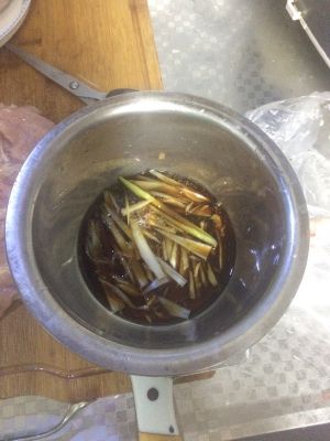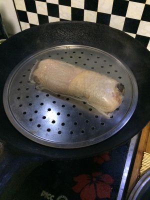 蒸好后取出保鲜膜用绳子再次将鸡腿缠紧。锅内放入适量的糖放上帘子鸡腿放入盖进行熏蒸;冒烟后2分钟立即关火。