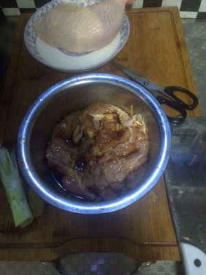 将鸡腿肉放入碗中,加入老抽、生抽、料酒