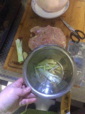 洗干净鸡腿肉,在肉身上涂点盐和黑胡椒腌制,大概腌制15分钟。姜末我是后来放上去的。皮蛋切成条状备用