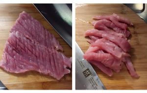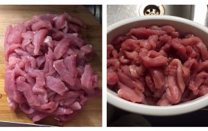 里脊肉先切片,约0.5cm厚,之后用刀背将肉锤松,然后切成肉条