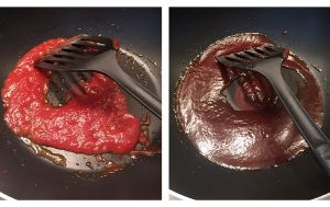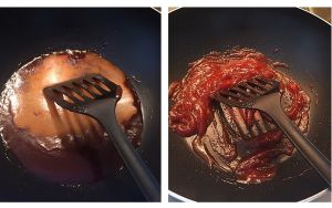 锅中留少许油,下4勺番茄酱炒出红油后,倒入调好的糖醋汁,混合均匀