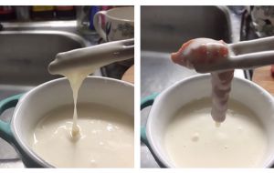 面糊的浓稠程度,如上图所示,里脊肉条挂糊