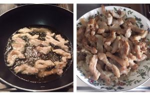 锅中倒油烧热,当插入一根筷子,筷子周围迅速冒泡泡时,油温就够了,可以开炸,注意,炸的时候不要一股脑的把全部肉条都丢下去,这样很可能会相互粘在一起,所以肉条要分次放入油锅。炸好后的肉条捞出,放入盘子沥沥油,如果喜欢特别脆的,可以炸两遍