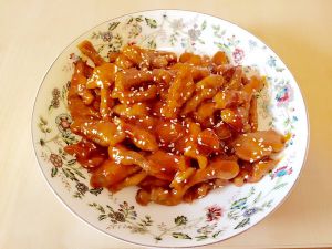 最后,倒入之前炸好的里脊肉条,均匀的滚上糖醋酱汁,装盘,撒上芝麻,即可