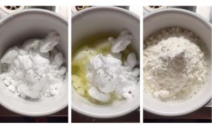 现在开始调面糊,3勺淀粉,1个蛋清,3勺面粉,再加入少量水,混合均匀,调成面糊