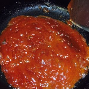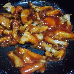 炸好里脊锅内留少许底油,下番茄酱炒一下,倒入调好的糖醋汁