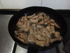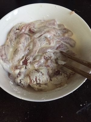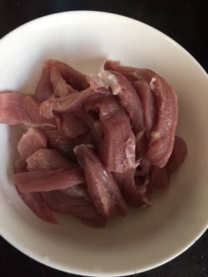 切成长条,加入料酒腌制一会,这步忘记拍照了..