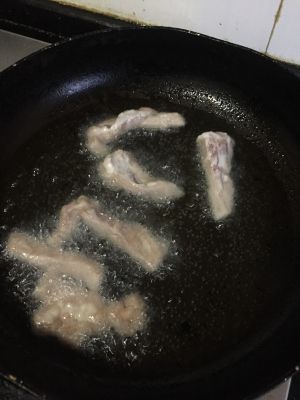 油倒入锅中烧至五成热,一条一条的下入里脊肉,开大火炸至两面微黄