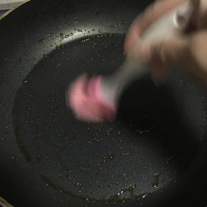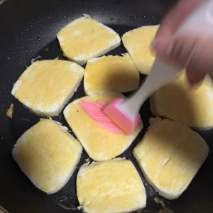 刷子抹油,记得用厚底不粘锅噢。厚底!切记,升温保温能力强,其他锅如果放这点儿油,馒头片容易糊。