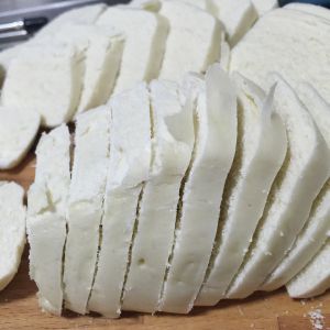 馒头切成均匀的薄片。我买的是那种方形的馒头,一个大约50g,比圆形馒头好切。