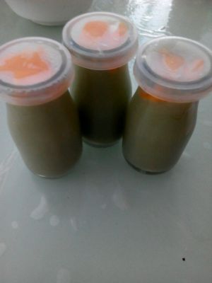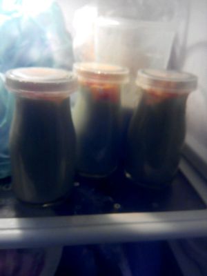 加450ml开水和75g布丁粉,均匀搅拌至融化,尽快放入布丁瓶中,等凉了放入冰箱