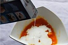 取三两个小碗,把牛奶芒果液快速地过滤到干燥的小碗中(并不是非常好过滤,因为比较浓稠,可以用蛋轴在筛子上搅拌帮助过滤,要快速是因为它会很快凝固。过滤可以使之口感更快细腻,不过滤也可以)。