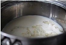 牛奶倒进汤锅里烧热,控制好温度,不要烧到沸腾的程度。把鱼胶片和白糖放在牛奶里搅拌融化,关火,晾凉。