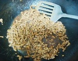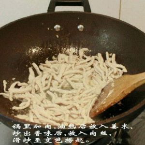 炒锅注油烧至五成热,下肉丝炒至变色,盛出待用。