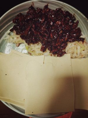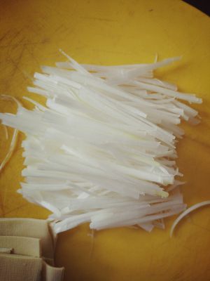 大葱切丝 豆腐皮切片 放盘中把肉丝倒入