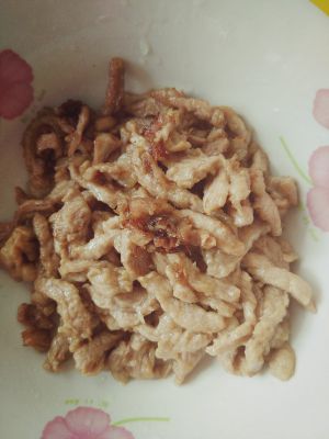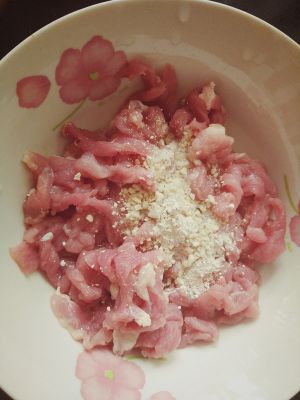 把猪里脊切丝,加入淀粉、料酒和少许油。