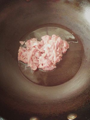 把搅拌好的肉丝下锅,同时不断翻搅防止肉丝粘锅底