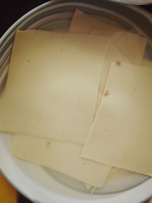 豆腐皮用热水过一下,然后切成块!可以用烤鸭小饼,鸡蛋薄饼代替都可以