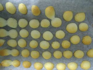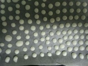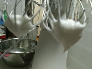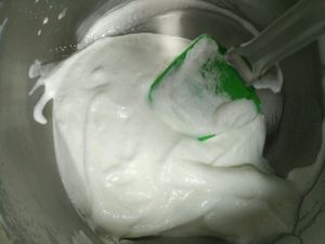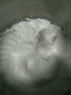 将蛋白中加入糖~柠檬汁打至硬性发泡~提起打蛋器有小尖~
