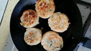 忘拍照了,平底锅放油,抓起一块面团,双手压平放到锅里,再用铲子按压几下,尽量让饼薄厚均匀。