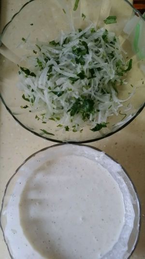 萝卜切丝,香菜切碎,加入盐,拌匀。面粉加清水盐花椒面调成面糊。