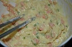 脆皮肠去皮切细丁,青葱切末。鸡蛋+面粉+少许清水调面稍稠的面糊。