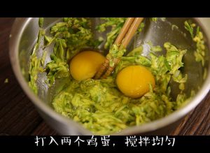在盛有西葫芦丝的盆中磕入两只鸡蛋