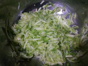 西葫芦擦丝,放入适量食盐杀汤儿(此步骤可省略)。出的汤不要到,更不要攥西葫芦丝。