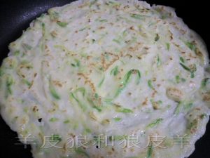 在做热的平底锅里放一小勺橄榄油,油热后舀一勺面糊摊成饼状