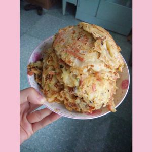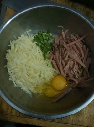 土豆 火腿 葱切丝 打入鸡蛋 放一碗面粉半碗淀粉 【根据人数可以自己放量】 之后再加入一碗水搅拌成糊糊状 放入平锅煎【当然也可以用电饼铛(ง •̀_•́)ง】记得刷油 否则容易糊和粘锅 两面上色多翻就好啦 加油、