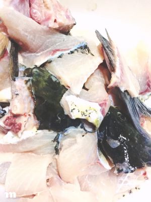 鱼肉切成片,鱼片用2克盐腌一会儿,鱼骨切成段